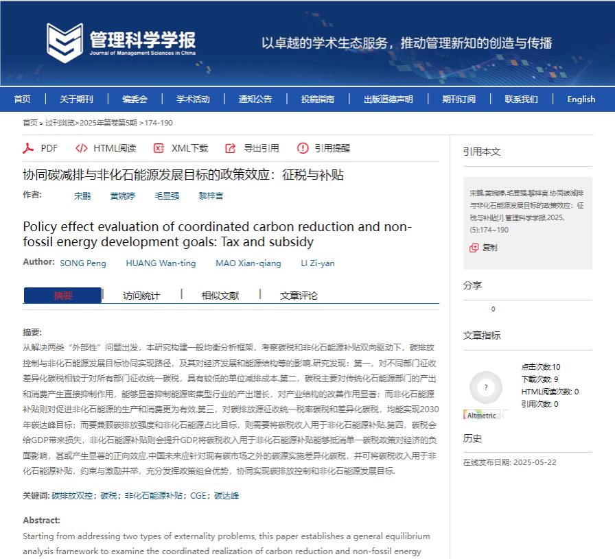 宋鹏教授及其团队的学术论文《协同碳减排与非化石能源发展目标的政策效应:征税与补贴》在《管理科学学报》2025年第5期正式发表。