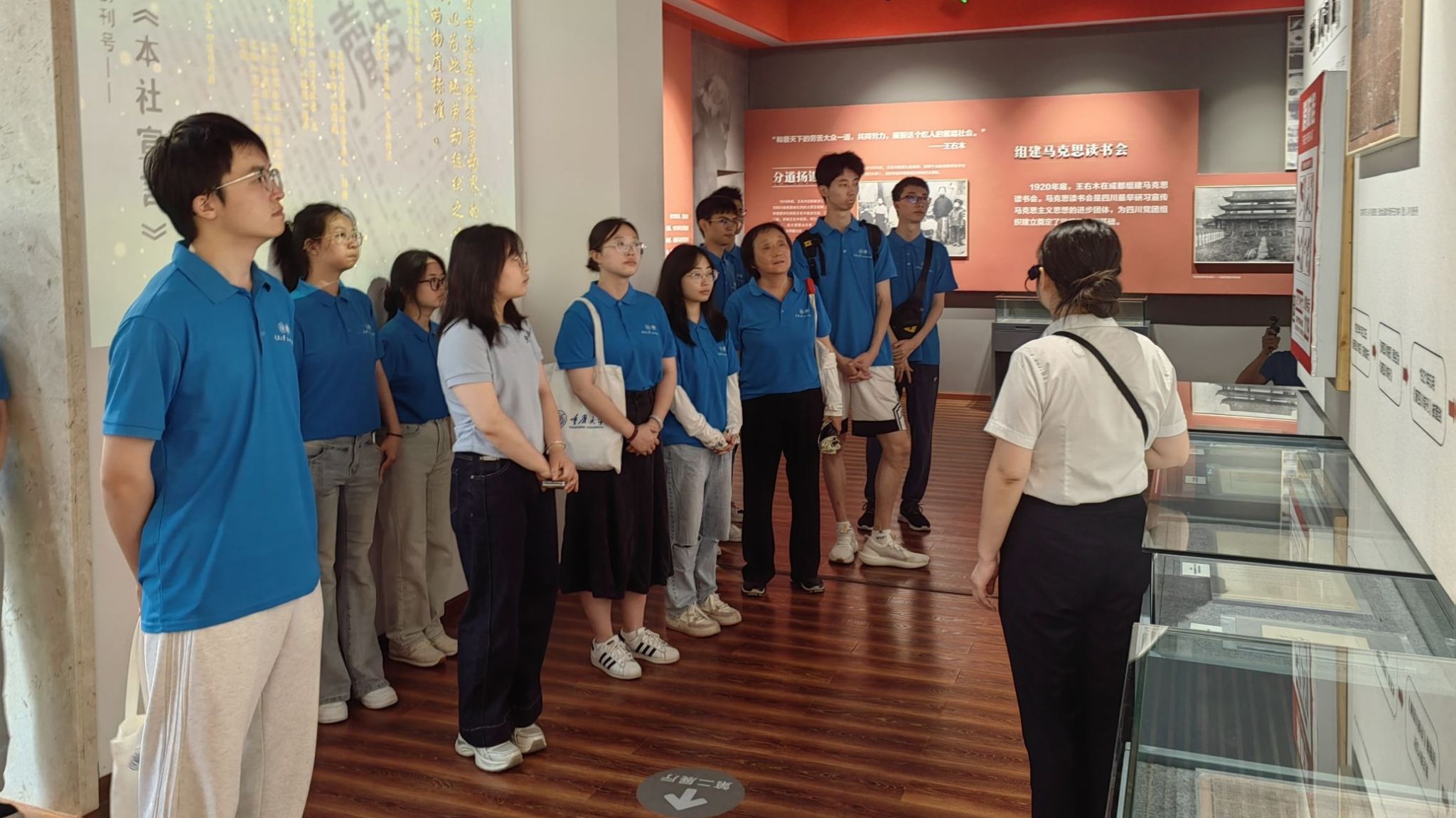 在讲解员的细致引导下,实践团依次参观了各个展厅。本科生一支部预备党员刘志庆在《人声》报创办史料展区驻足良久,指着展柜中王右木为筹措办报经费变卖家中田产的记载,向实践团成员感慨道:“革命先辈为传播真理倾尽所有,我们更要以公管专业能力破解双城民生难题。”两个支部还在报纸印刷设备复原区开展现场微党课,结合公共管理专业特色,讨论王右木“以笔为枪”的担当精神如何转化为推动成渝两地政策落地见效的实践动力。