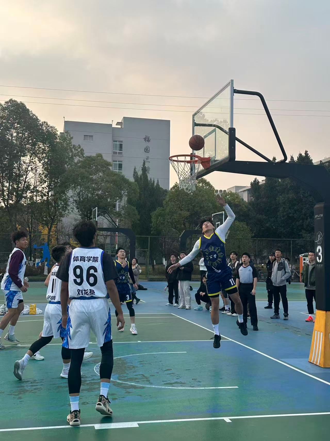 第三节,比赛进入白热化。体育学院篮球队发起猛烈反扑,公管男篮则稳扎稳打,依靠稳定得分保持领先。三节战罢,公管男篮以36:33继续领跑。