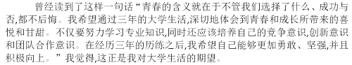 的同学,同学们的生涯规划之中不仅有对个人的发展的期许,更有对为社会发展贡献一己之力的自觉。在认真规划未来的同时,同学们也对时代发展变化与自身的关系有着深刻的认识,就像一位同学所写到的那样:“社会是不断发展变化的,而且是不断向前发展,我们不可能一成不变地按照规划实施,所以,这个规划也只是一个大纲,而具体的,也会随着社会以及自我的发展作出适时的调整,以便适应社会的需求与发展。”