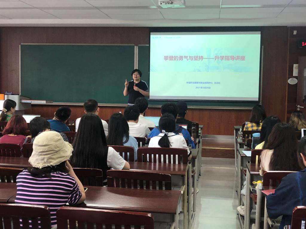 关于推免、考研和留学的升学专题指导,有幸邀请到学校学生职业发展与就业指导中心副主任刘卫红老师,刘老师凭借其丰富的升学指导经验,以三个关于升学与就业的典型案例作为前奏,引出“升学=攀登=勇气+坚持”这一主题,深入浅出地分析了保研、考研以及出国这三种升学路径选择的特征,以这三种目标途径为独立单元,在“一问一答式”互动中阐明了当下同学们应当密切关注与查漏补缺的事项。在推免模块,刘老师面面俱到地为同学们分析了内外推免的条件、时间节点等相关事宜,提醒大家多多留意各类院校举办的“夏令营”等能够展示自身学习与科研能力的活动;在考研模块,刘老师以本校数据为例,在强调当下考研竞争压力愈发沉重的同时,更鼓励备考求学的同学们不要“遇难而退”,前程依旧是一片光明的;在出国留学板块中,刘老师让大家扩宽思维、大开眼界,冲击名校的同时也不要忽视一些必要的因素。在交流互动环节中,2018级的田明昊同学向刘老师询问关于院校选择的一些细节问题,刘老师也做出了客观详细的回答。