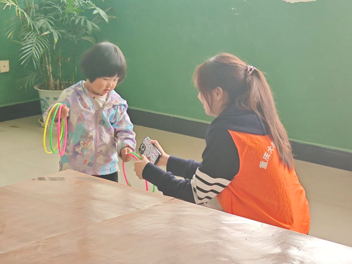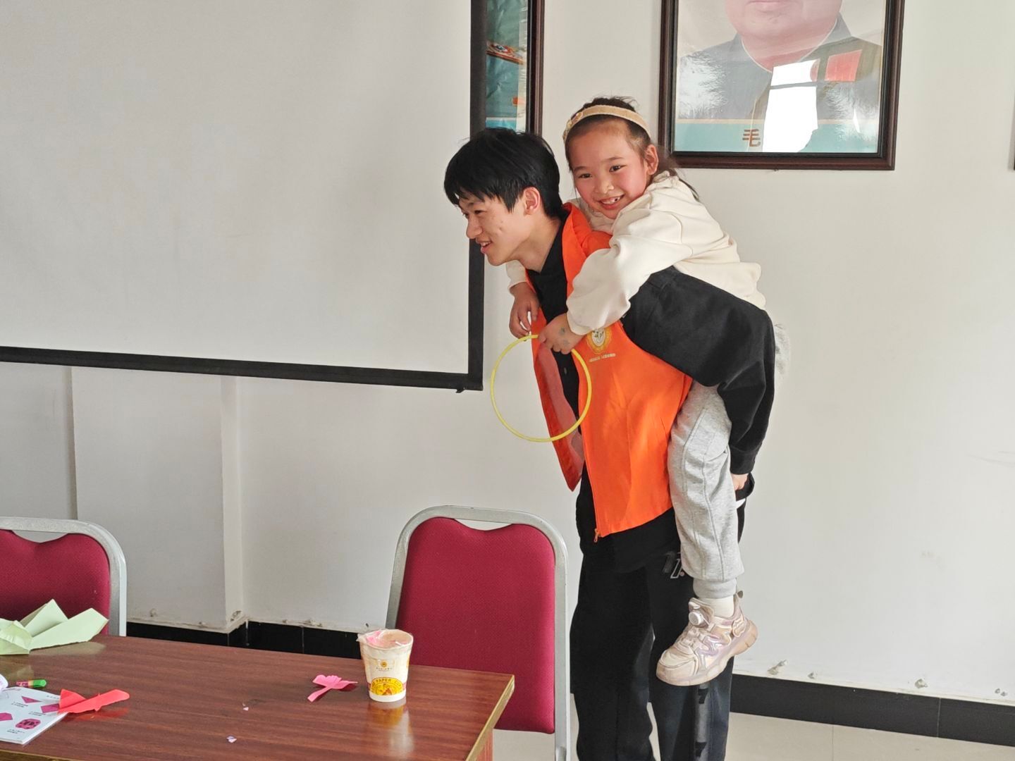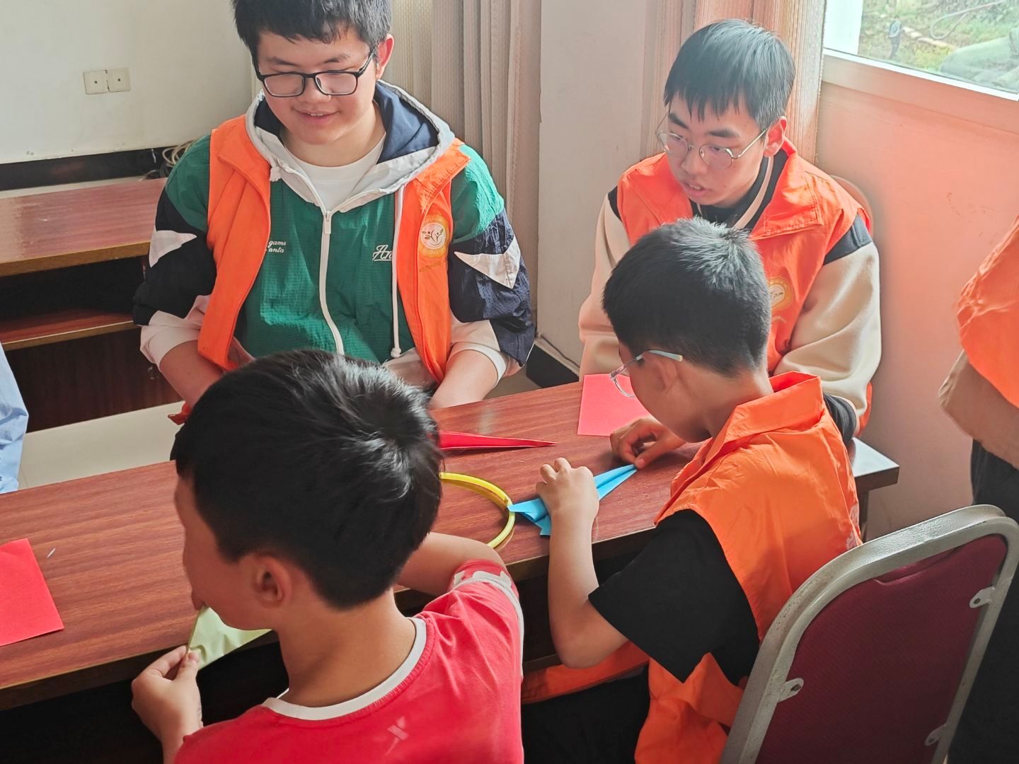 活动现场,志愿者们身着橙色马甲 ,热情地陪伴着小朋友。有的志愿者与小朋友一起玩彩色环,互动温馨;有的围坐在桌旁,耐心地和小朋友一起折纸,桌上摆满彩纸、剪刀和彩笔。志愿者们专注又温和,小朋友们认真投入,整个场景充满了温暖与关爱,展现出志愿者与小朋友和谐愉快相处的美好画面,传递出浓浓的温情与善意。