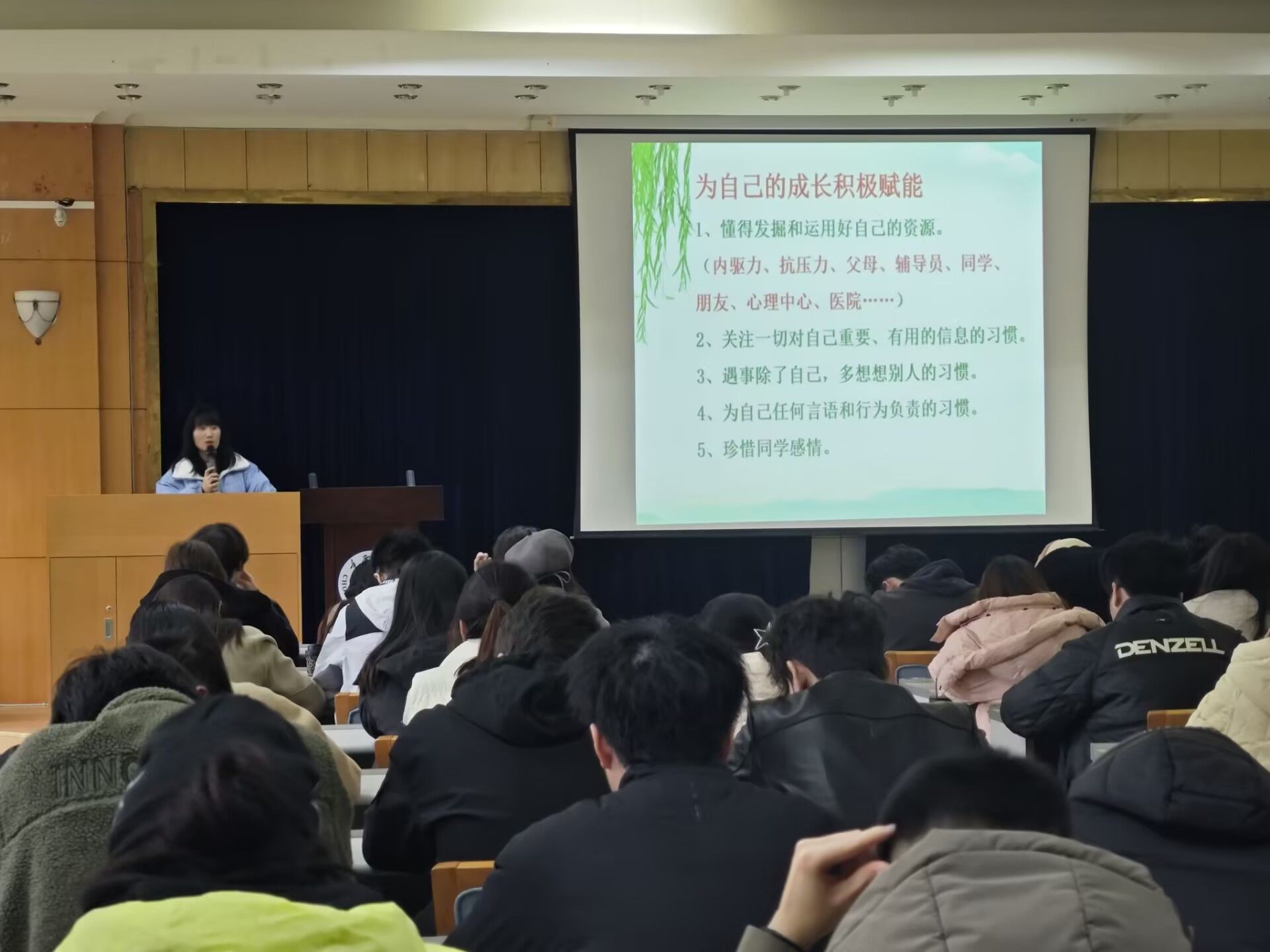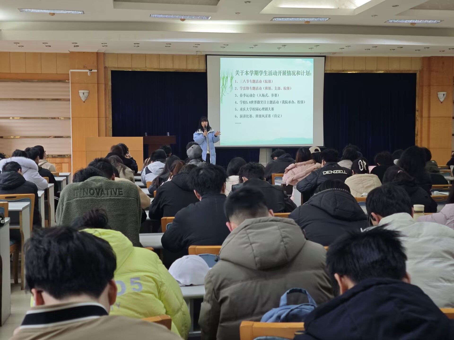 在学生活动方面,徐柳老师介绍了本学期学校、学院和年级将要开展的活动计划,包括2025年春季运动会、承办全校心理文化节世界微笑日主题活动、校园心理剧大赛等,旨在为同学们提供展示自我、锻炼能力的平台。徐老师鼓励同学们积极参与,抓住每一次拓展自我能力的机会,提升综合素质。