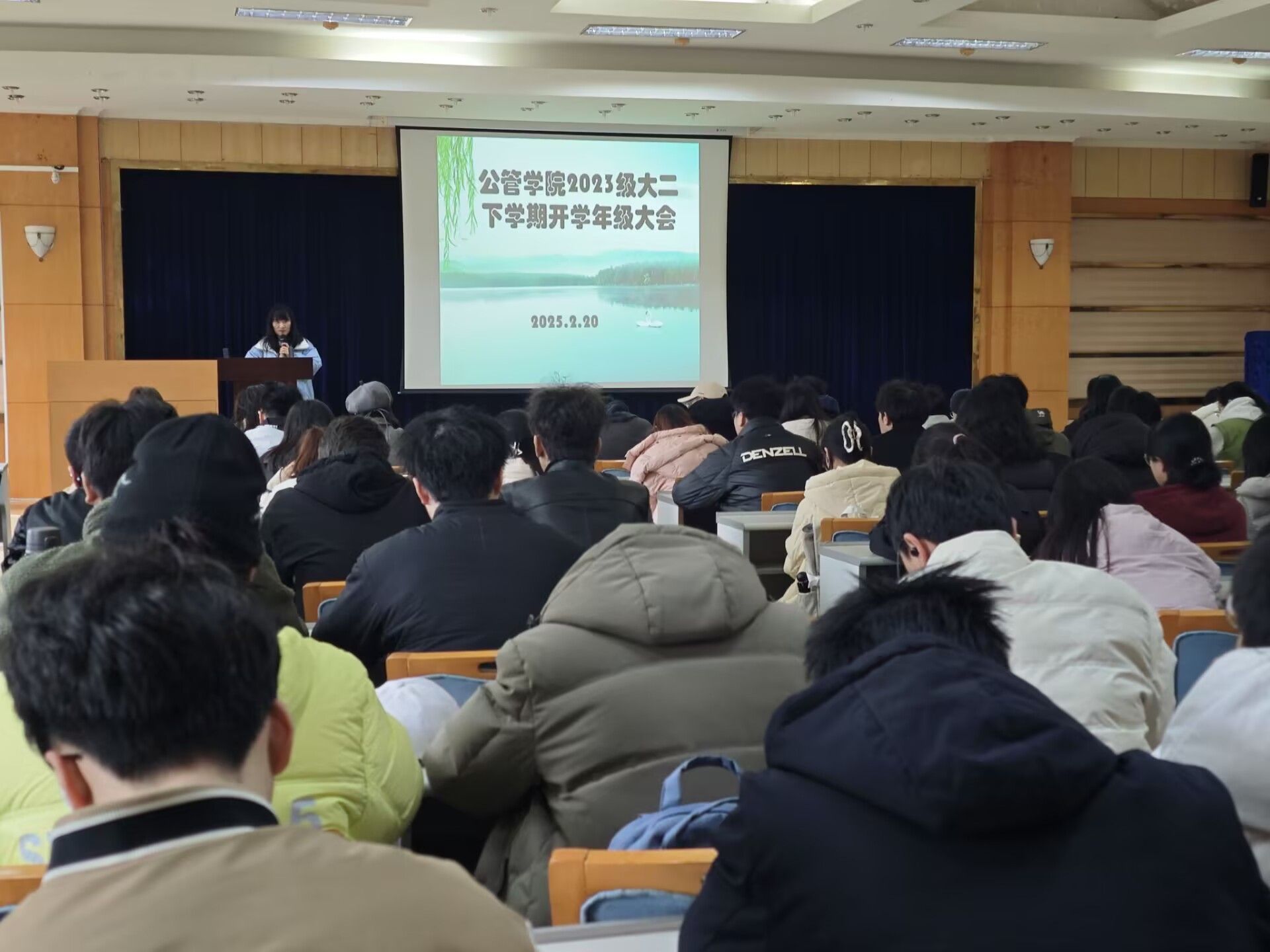 2023级本科生在学院202报告厅召开了本学期开学年级大会。本次会议由学院团委书记兼21级、23级辅导员徐柳老师主持,旨在帮助同学们明确学习目标和生涯规划,共同迎接新学期的挑战与机遇,2023级全体学生参会。
