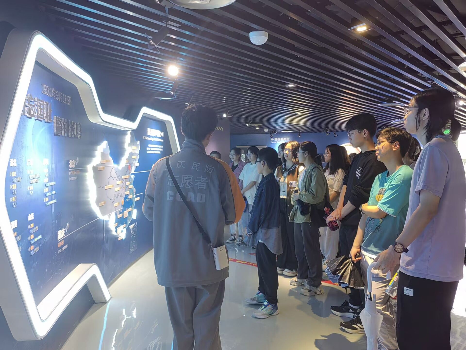 重庆市人民防空宣传教育馆,不仅是重庆中心城区最大的人民防空宣教馆,更是一个承载着深厚历史记忆与现代科技融合的独特空间。 同学们冒着小雨刚进入人防馆,就被面前的纪念碑所吸引,讲解人员介绍到,这是纪念1938-1944重庆大轰炸所设立的纪念碑,集中体现了重庆市人民坚忍不拔、保家卫国的决心。