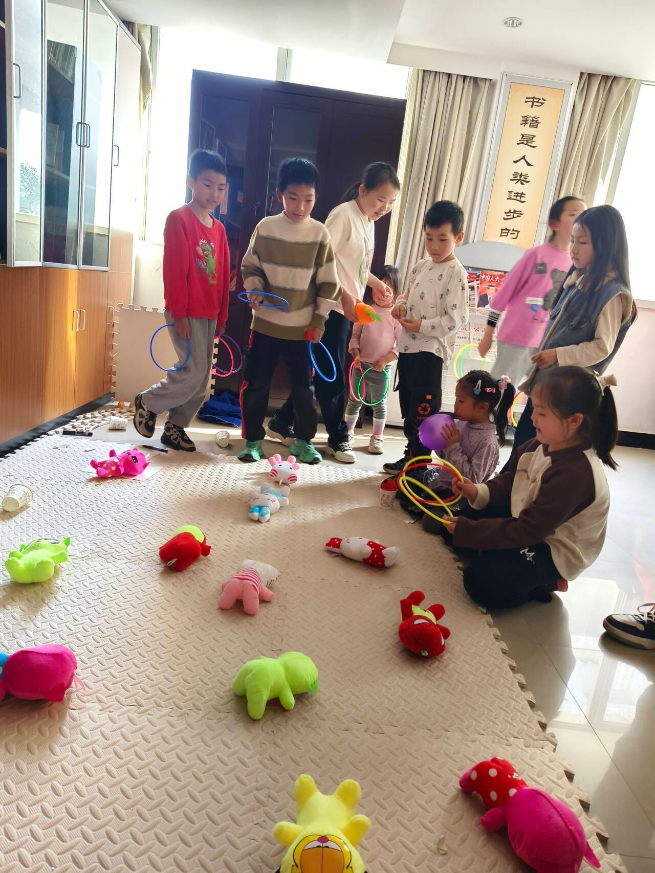 春意正浓,日头正盛,在作业辅导环节结束后,小朋友们用蜡笔和水彩笔佐以想象,在纸上绘出了自己心目中的明媚春日。“雷锋月—安林行”活动策划组在以往的体育活动的基础上又添新招。以随处可见的路边小摊上的纸杯和套圈为灵感,从开始的气球吹纸杯,乒乓球入杯到用套圈的方式让每位小朋友可以凭自己实力获得奖品。此次创新活动提高了小朋友们的身体协调能力,而凭自己实力获得的奖品也让他们有着满满的成就感。