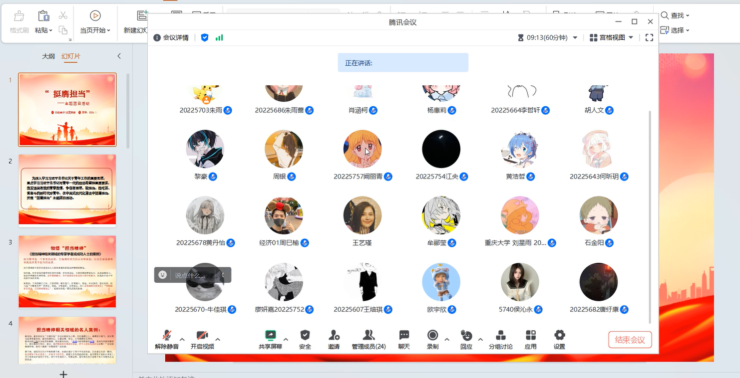 2024年1月14日上午,学院22级经济1班团支部在寒假开始的第二天,开展了“挺膺担当”主题团日活动。按校团委的要求,该团支部精心设计活动方式,用心安排互动环节,细心制作展示内容;团员们理论联系实际,认识结合实践,阅读材料并延伸思考,结合自身经历阐述感悟,达到了激发思想动力、培养责任担当的目的。该会议由团支部书记朱雨主持。