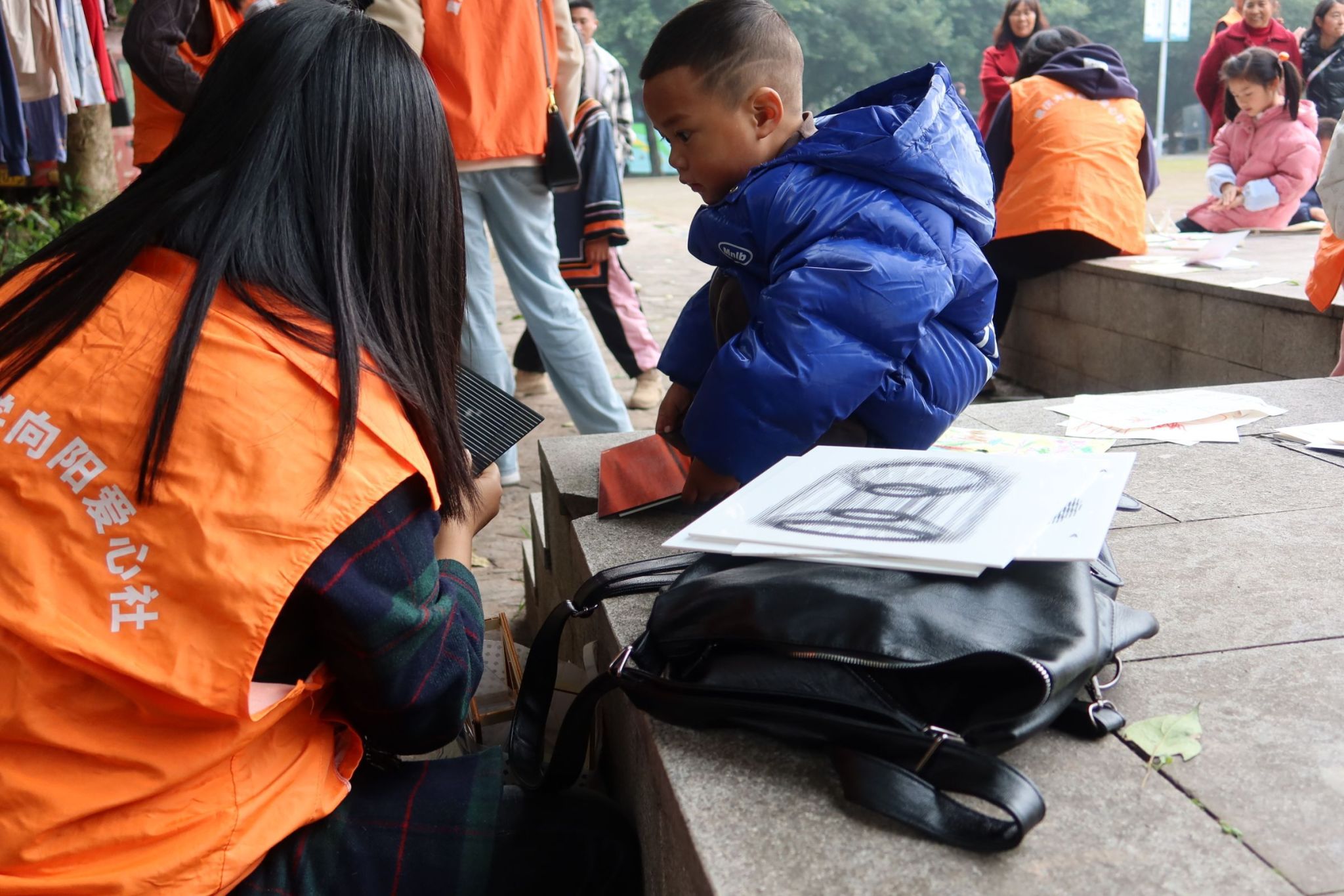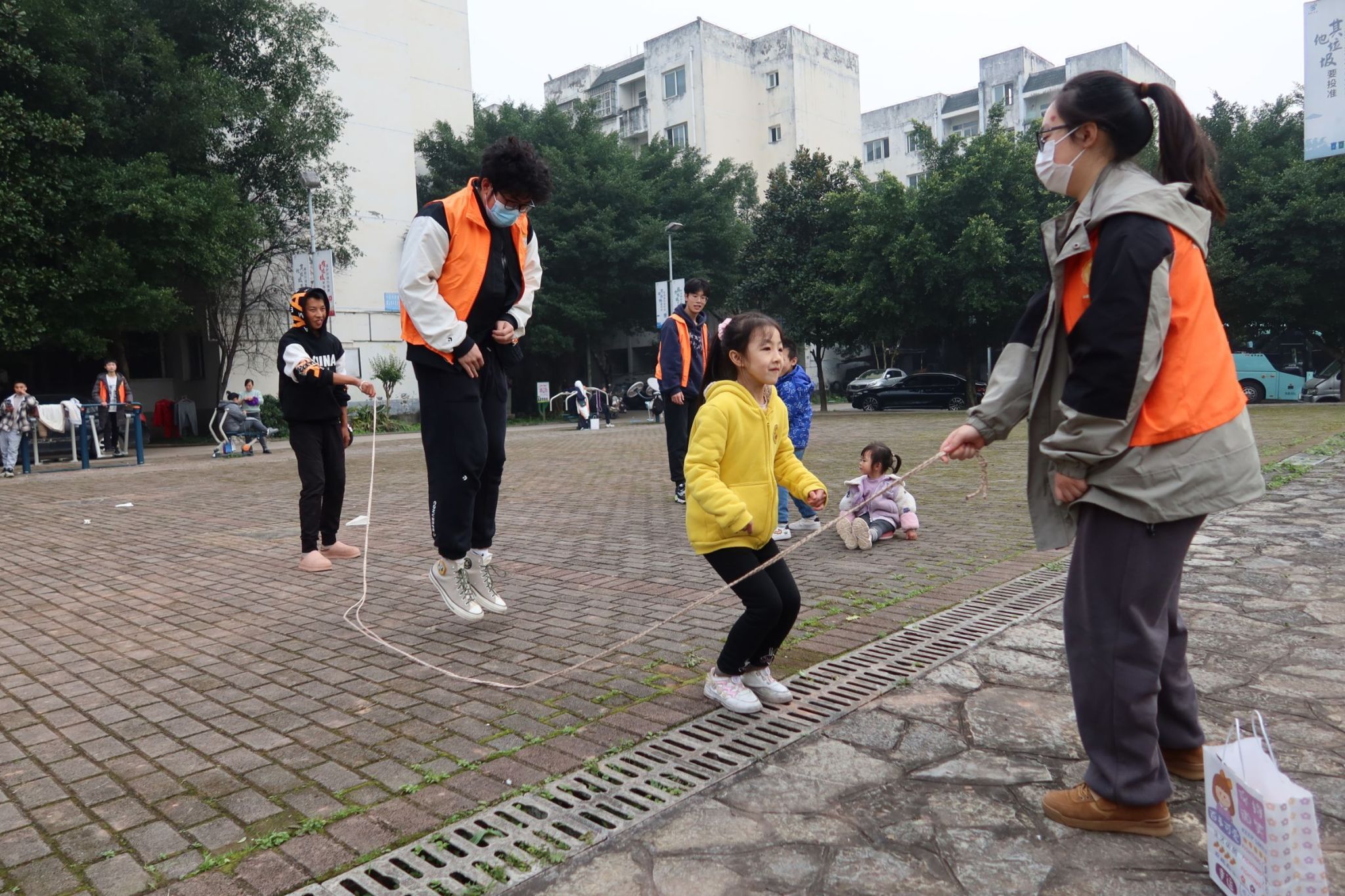 由于活动当天天气分外晴朗,我们决定带领小朋友们前往活动场进行体育运动。其中年龄稍大的小朋友在志愿者的组织下进行了羽毛球,抽陀螺,老鹰捉小鸡和蒙眼捉人等丰富的体育游戏。年龄稍小的小朋友在志愿者的陪同下于活动场周围看书,折纸。