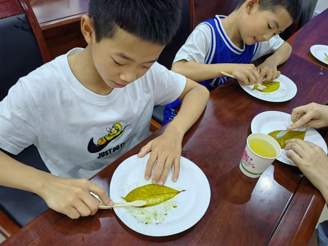 活动的后半部分是向阳爱心社与化学社联动开办的指导孩子们制作叶脉书签活动。志愿者们把处理过的树叶放进热水浸泡,并在等待时跟小朋友讲解如何制作书签。分发完材料后,就开始了制作过程。因为害怕损坏叶脉,动作都非常细致小心,刷一会儿又蘸水清理一下,拎起来确认一下情况,再接着刷。刷好后,他们自己选择了蓝色、绿色或者橙红色的色素给叶脉进行染色,然后将晾干的叶脉封进了透明塑封壳里,剪裁出想要的形状,并用打孔器打了孔装上了流苏……独立的制作赋予了书签额外的意义,孩子们得到的不只是一个美丽的叶脉,更体验到了化学的魅力所在。
