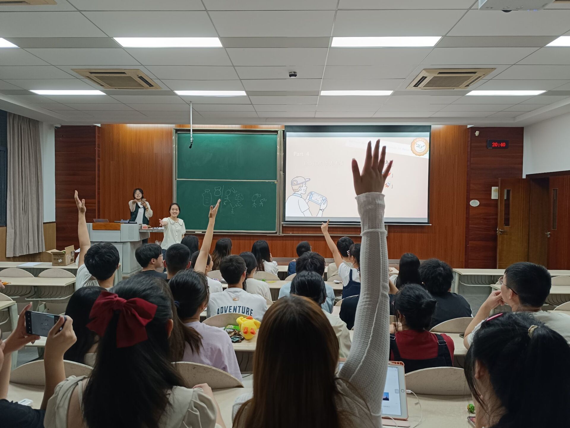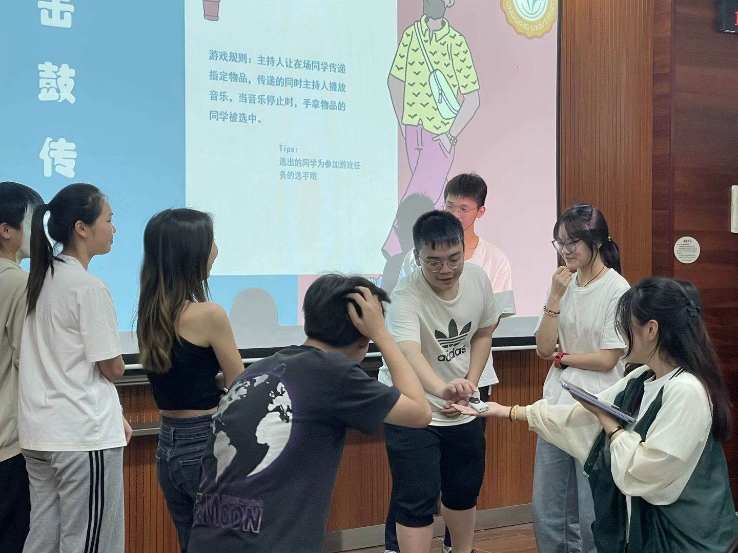 表演结束后,进入游戏环节,本次社庆准备了四个游戏,通过击鼓传花选出参与游戏的选手,一起完成了“歌词飞花令”“背后传字”“集体创作”“Emoji成语猜猜猜”等游戏,参与游戏的同学也获得了丰富的小礼物。在游戏中,社员们的关系进一步拉近。