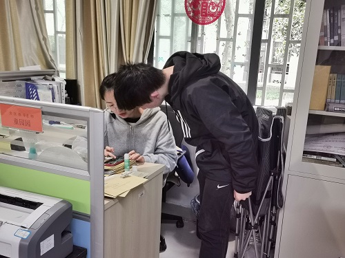 2021年3月10日下午,成绩单的打印、收集工作基本完成。19、20级各班班长、团支书齐聚虎溪校区松园办公室,紧锣密鼓地展开《给家长的一封信》和成绩单的装配和密封工作。各位班干部在王老师、李老师的带领下分工协作,有条不紊。装配工作以班级为单位进行。各位班干部分类整理、叠放本班文件,一一检查信封的书写、邮票的粘贴是否规范。合格的信封将进入资料分装密封环节,在确认信息无误后统一寄出。
