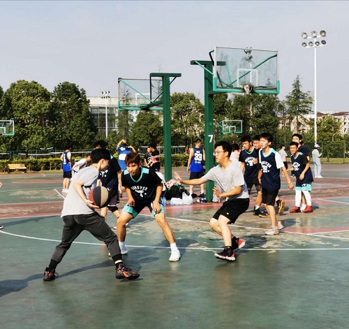 随着一声哨响,篮球被竖直抛向空中。原本凝滞的赛场瞬息万变。球员们蜂拥而上抢夺篮球,在球场上自如地奔跑,跳跃。上半场刚刚开始,各队球员很快便进入状态。经三与公四的冠军争夺赛尤其精彩,两队可谓强强交锋,场上形势变化不断。公四队取胜欲望强烈,开场即对经三快攻猛打,丝毫不给经三队喘息的机会。也许是没有摸透对方战术,经三队在上半场的比赛中总体处于被动的局面,赛场局势基本由公四掌控。上半场结束,公四队领先11分。中场休息时,场上各队球员迅速跑至休息区补充体能,调整战术。