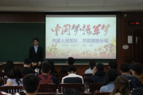 下午5时,演讲比赛正式开始。首先上场的是来自16级公管三班的李佩芷。谈及强国强军的宏伟愿景,她深情地说道,“从小爷爷对我的教导使我懂得了中华民族享有当下之生活的来之不易,也领会了无数革命先烈志士的崇高爱国情怀。所以今日之中国青年理应坚守住实现中华民族伟大复兴的光荣旗帜,共筑我们美丽的中国梦。然而这个梦的重要部分就是伟大的强军梦。”