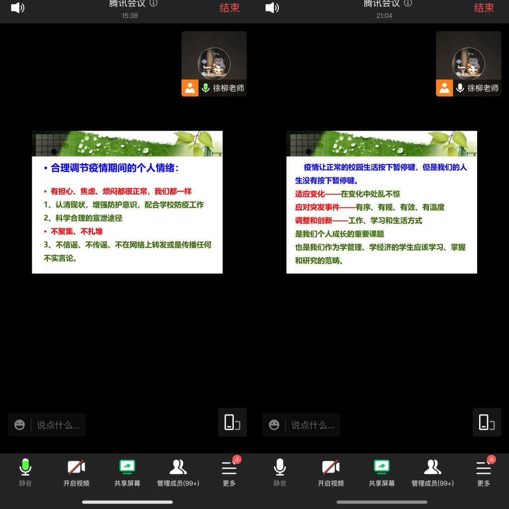 本学期过半,徐老师提醒同学们,要科学安排疫情期间的学习和生活。停课不停学,充分利用网络平台统筹各课程学习资源,认真完成学习任务;同时加强体育锻炼,提高身体素质和抵抗力,保持正常作息,合理安排和利用时间,保持良好的心态,实现疫情防控和学习生活两手抓。徐老师还特别提到,疫情封校期间,同学们要学会调节情绪,选择科学合理的宣泄途径,遇到问题或困难第一时间向老师,向身边的同学求助。