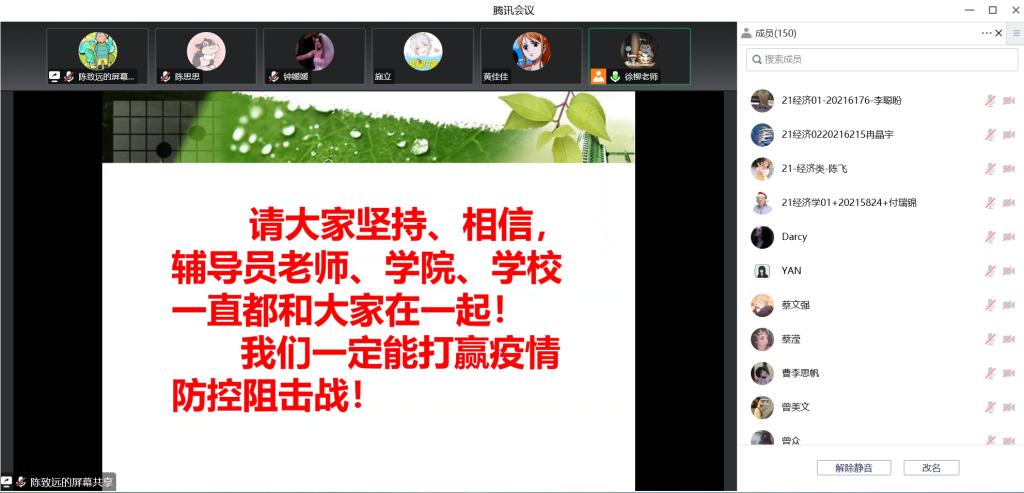 众志成城抗疫情,会议的最后,徐老师向同学们传达:“请大家坚持、相信辅导员老师、学院、学校一直都和大家在一起!我们一定能打赢疫情防控阻击战!”终有烟消云散时,守得云开见月明,相信在全校师生的共同努力下,我们终将在这场没有硝烟的战争中赢得胜利的曙光。