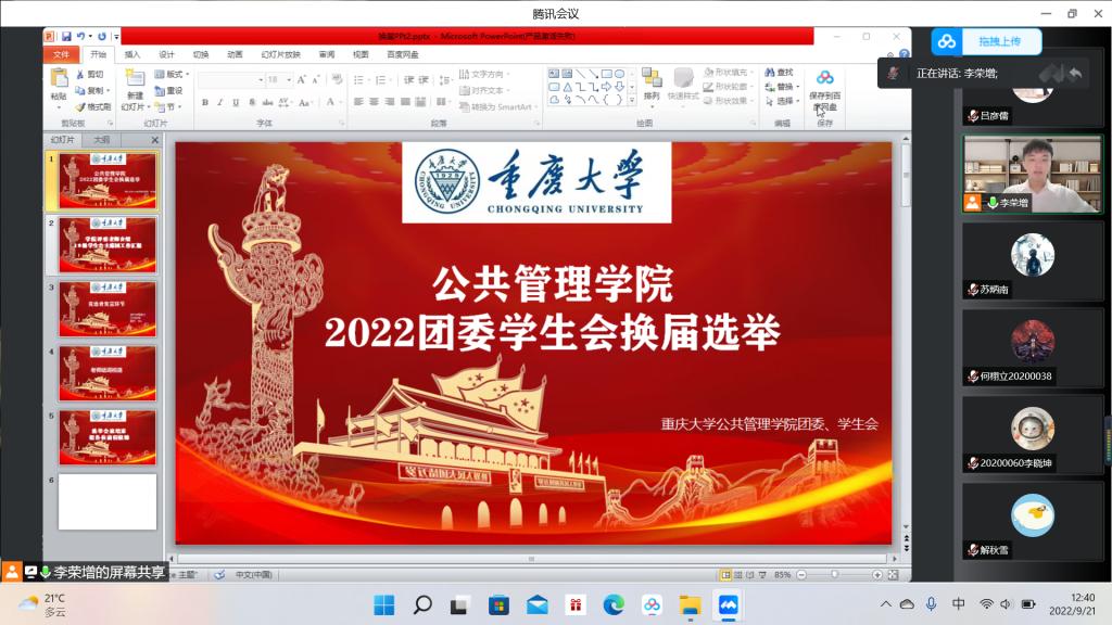 2022年本科生团委学生会换届选举如期举行。由于疫情防控的原因,本次选举采用线上举行的方式,学办主任兼19级辅导员王丽娟、团委书记兼21级辅导员徐柳、20级辅导员包晗、19级团委学生会主席团成员以及20级参与本次换届选举的同学参加会议。