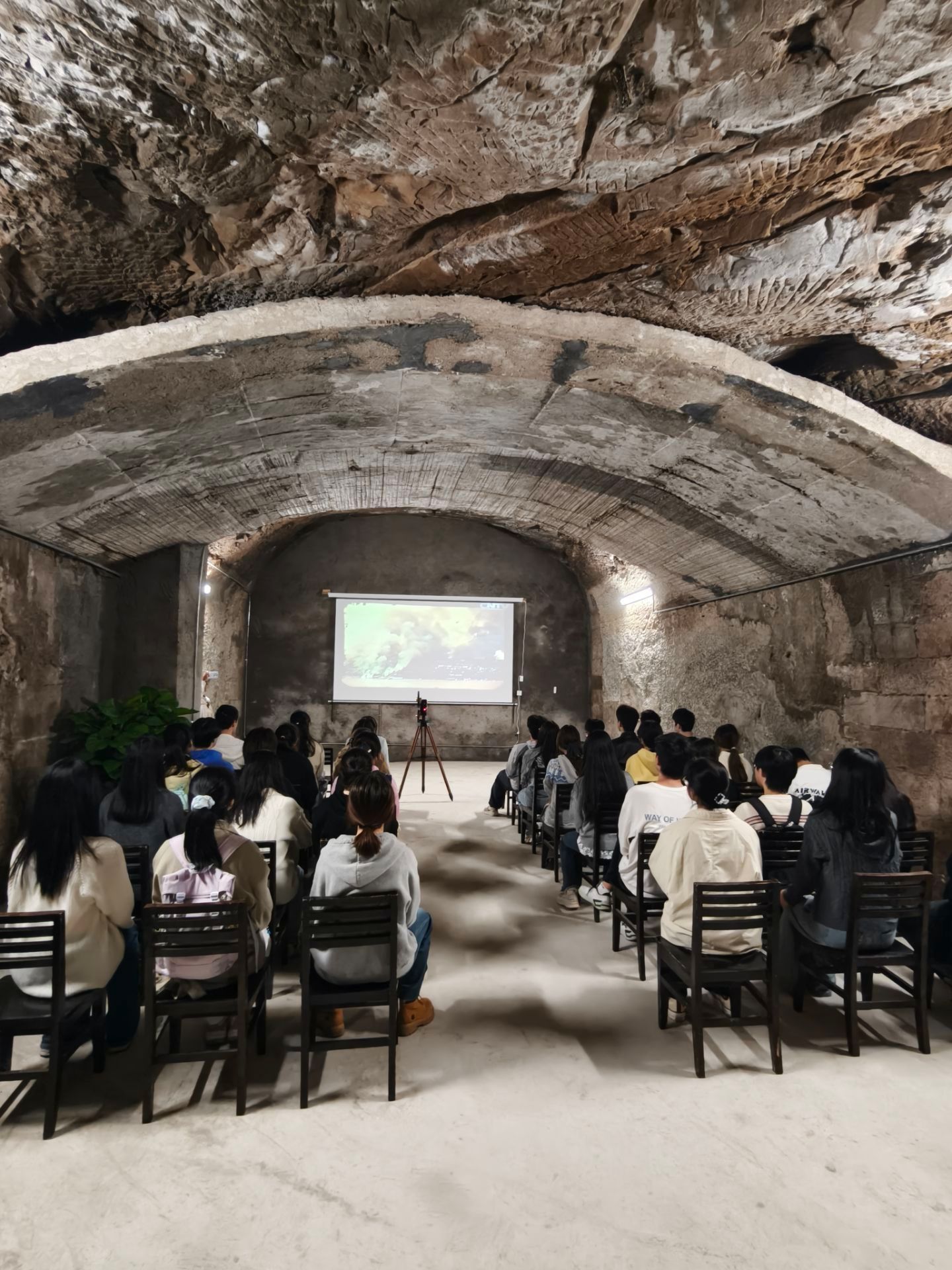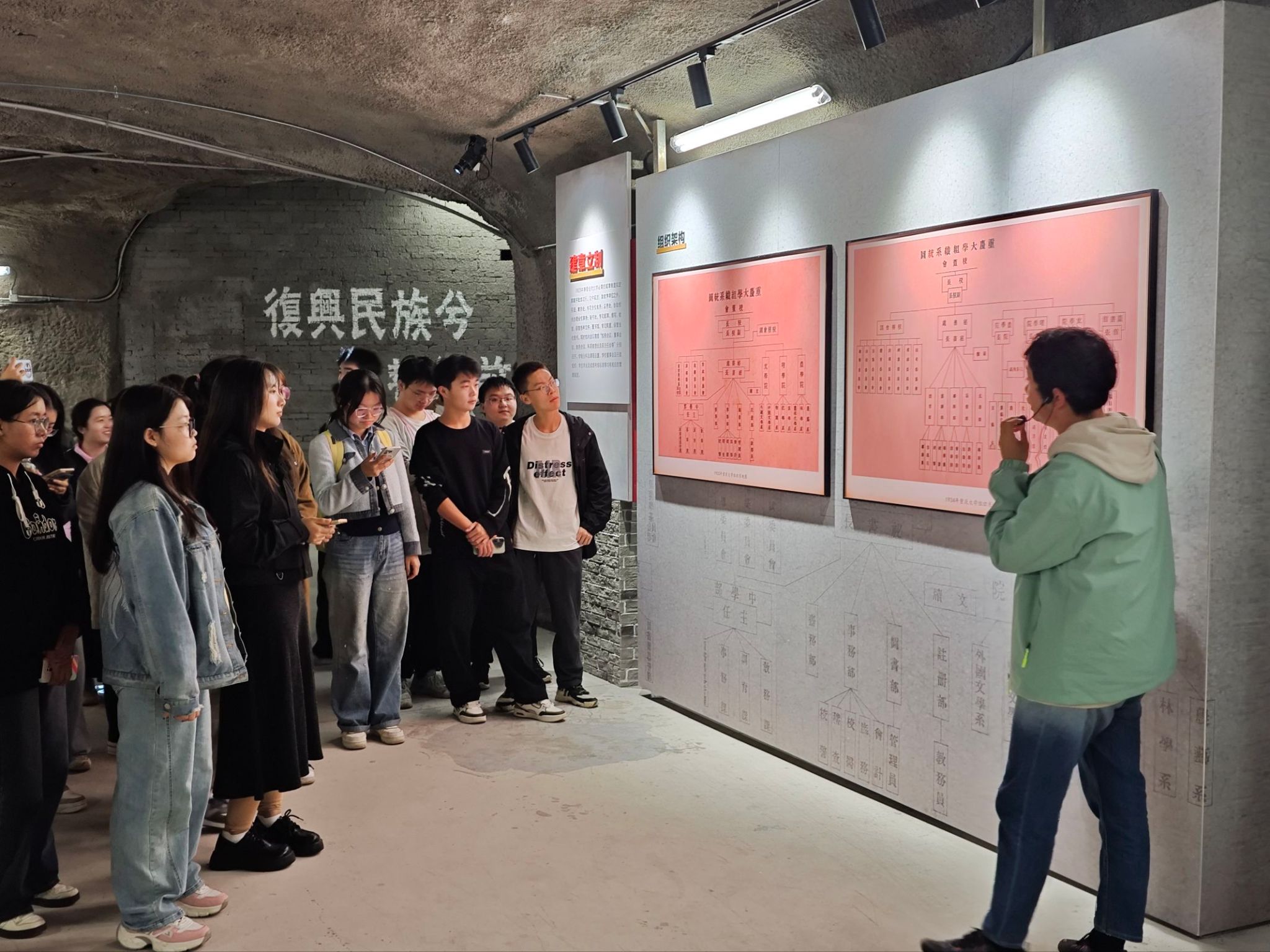 在复原的战时党团活动室内,泛黄的课桌椅、斑驳的黑板瞬间拉近距离,同学们静坐观看重庆大轰炸纪录片,仿佛穿越时空与先辈对话。辅导员徐柳老师结合历史细节与同学们交流感悟,鼓励大家从“弦歌不辍”的办学精神中汲取力量,现场氛围庄重而热烈。活动尾声,全体师生在防空洞 “复兴民族,誓作前锋”题字下与基地前合影,让红色记忆定格成永恒。