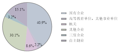 就业单位以国有企业为主体,去往国有企业共38人,占比41%,集中在建筑业、金融业和制造业;其次是其他企业(民营等),共28人,占比30%,分布在各个行业,主要是房地产业和金融业;三资企业有3人,分别在金融业和制造业;机关单位有8人,均为选调生或普通公务员;另有高等教育单位或者其他事业单位2人,及自由创业14人分布在餐饮单位和培训单位。