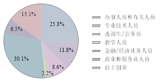 硕士毕业生以选调生或公务员居多,共60人,占就业总数的37%,其中的85%集中在重庆市;金融/经济业务人员21人,占比13%,基本都在金融业,然后分散在信息传输、交通运输等行业;专业技术人员为18人,占比11%,主要在房地产业和建筑业,零散分布在交通运输业和医疗卫生行业等;担任教学人员共有14人,相比本科生多很多,其中12人都在高等教育单位,1人在中初教育单位,剩下1人在教育培训机构;办事人员和有关人员共36人,占比22%,广泛分布于公共管理社会保障组织、房地产业和制造业;另有7人从事商业和服务业人员,零散分布在房地产业和交通运输业;其他人员共5人,行业各不相同;另有进入部队1人。