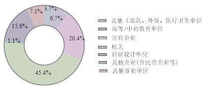 硕士生近一半在政府机关单位,共122人,占比45%;进入其他事业单位的共19人,占比7%,基本都在公共管理、社会保障和社会组织中;其次为国有企业共55人,占比20%,主要是制造业、金融业、制造业和电力、热力、燃气及水生产和供应业;在其他企业(含民营企业)中共42人,占比16%,主要是房地产业、金融业和制造业;硕士生进入高等/中初教育单位18人,占比7%;其余则为科研设计单位(3人)、部队(3人)、外资(3人)、医疗卫生单位(4人)。