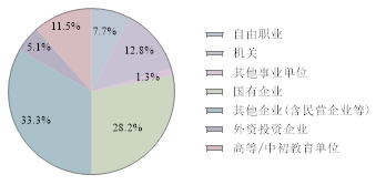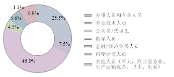 硕士毕业生近一半为选调生或公务员共125人(其中选调生为32人),占就业总数的47%;办事人员及相关人员共68人,占比26%,广泛分布于公共管理社会保障组织、电气水供应信息传输业和金融业等等;专业技术人员为20人,占比8%,主要分布在卫生和社会工作、制造业等;金融/经济业务人员15人,占比6%,基本都在金融业;担任教学人员共有12人,其中6人在高等教育单位,4人在中初教育单位,还有在科研设计单位的科学研究人员3人;另有住宿餐饮业和租赁服务业商业和服务业人员2人,其余各种人员22人,大多分布在制造业和信息传输业。