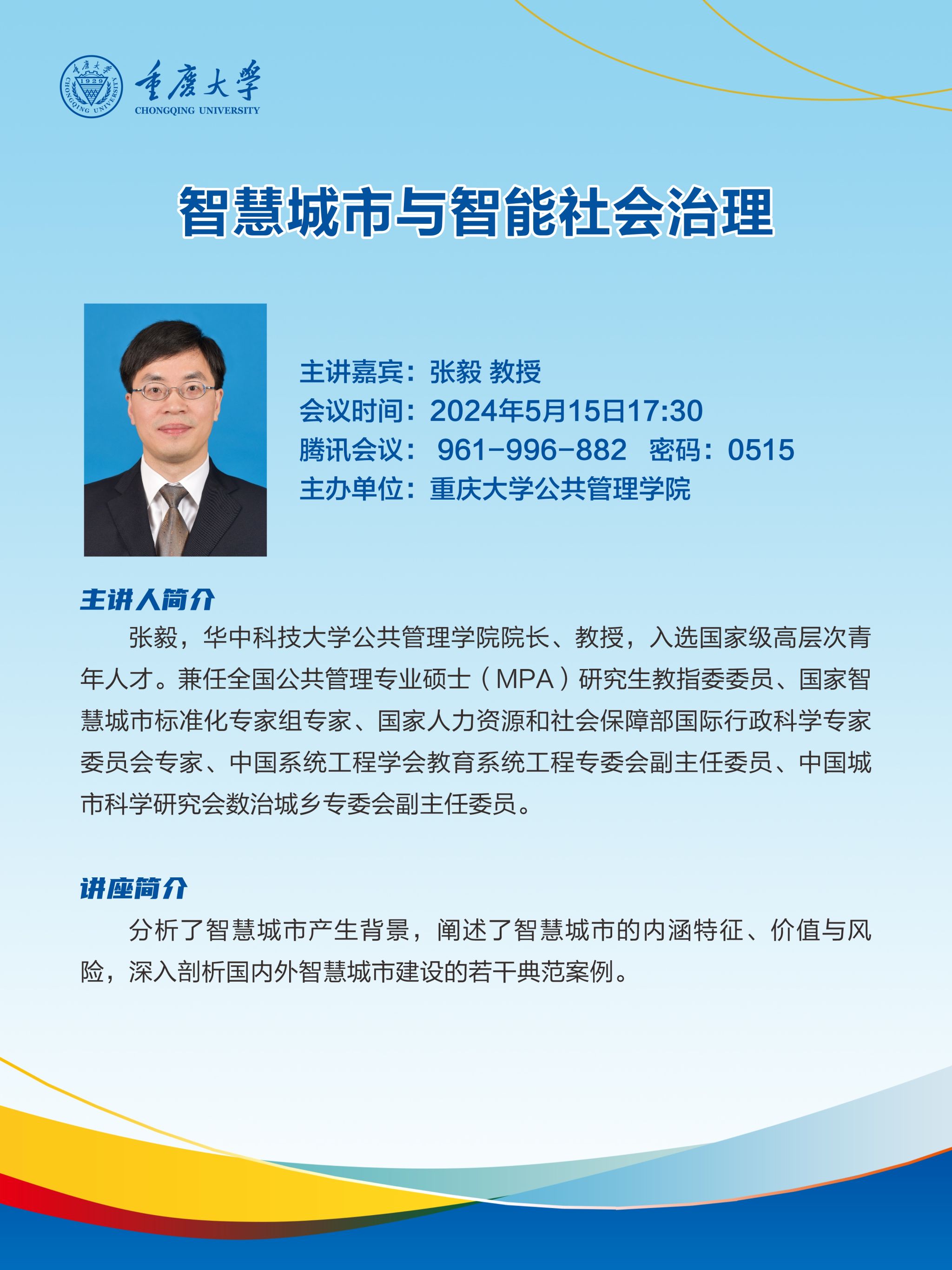 2024-06-18教授 博士生导师张毅讲座主题:智慧城市与智能社会治理主讲人简介:张毅,华中科技大学69书吧 院长、教授,入选国家级高层次青年人才。兼任全国公共管理专业硕士(MPA)研究生教指委委员、国家智慧城市标准化专家组专家、国家人力资源和社会保障部国际行政科学专家委员会专家、中国系统工程学会教育系统工程专委会副主任委员、中国城市科学研究会数治城乡专委会副主任委员。5月15日,我院特邀华中科技大学69书吧 院长...