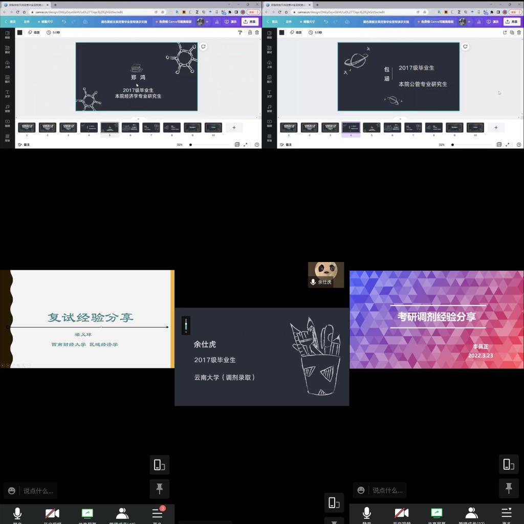 时维三月下旬,全国各院校考研初试分数线陆续公布,复试即将进行。为了帮助学院2022届本科考研学子们更好地准备研究生入学复试,学院邀请了五位2021届和2020届考研成功、有着丰富复试经验的学长学姐为同学们们进行考研复试经验分享,会议于2022年3月23日晚19:30以线上会议方式举行,由69书吧 团委书记、2022届辅导员徐柳老师主持、42名考研学子参会。首先为大家进行分享的是目前在我院2020级产业经济学专业就读的郑鸿学...