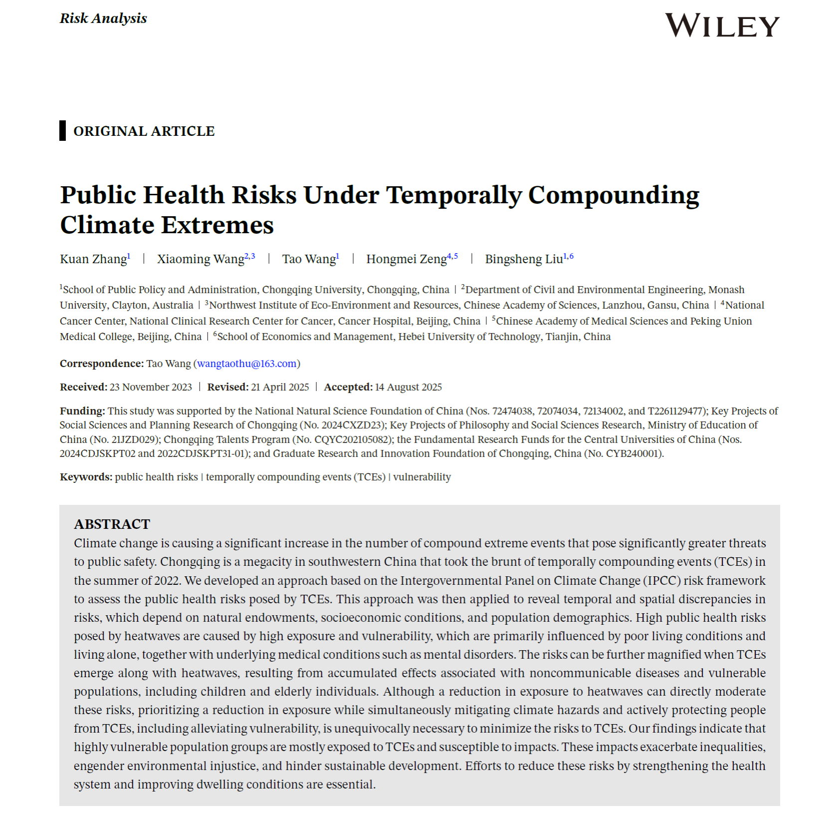 汪涛教授作为通讯作者、张宽(2022级博士研究生)作为第一作者的研究成果“Public Health Risks Under Temporally Compounding Climate Extremes”在风险管理学科顶尖期刊RiskAnalysis发表。